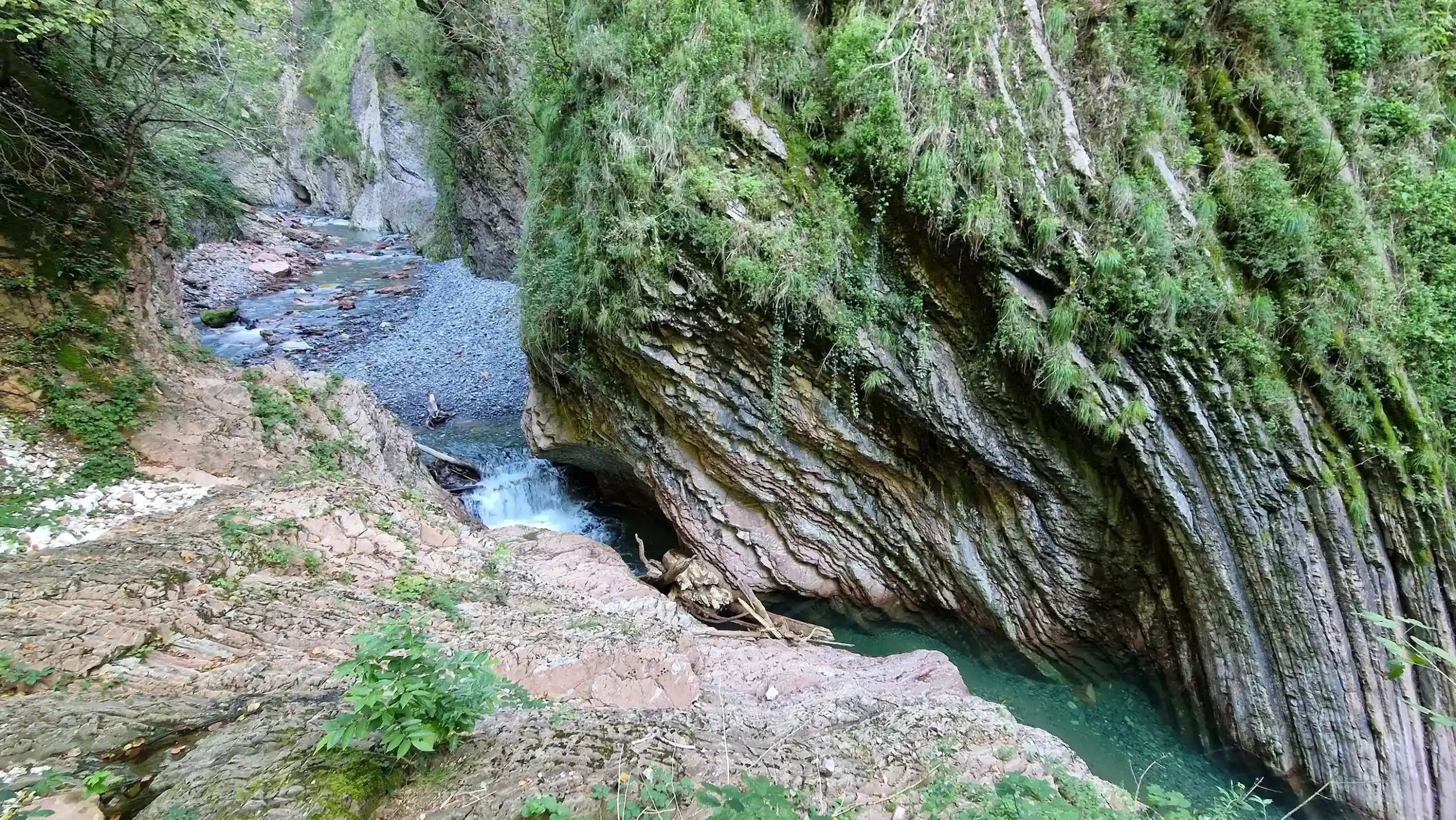 Il continuo scorrere del fiume ha inciso profondamente le rocce calcaree, rivelando sequenze stratificate che mostrano antichi fondali marini, tracce di organismi fossili e segni dei movimenti tettonici che hanno sollevato le Alpi.